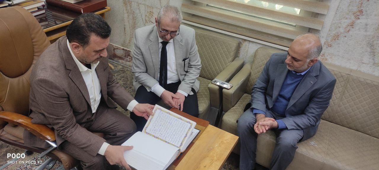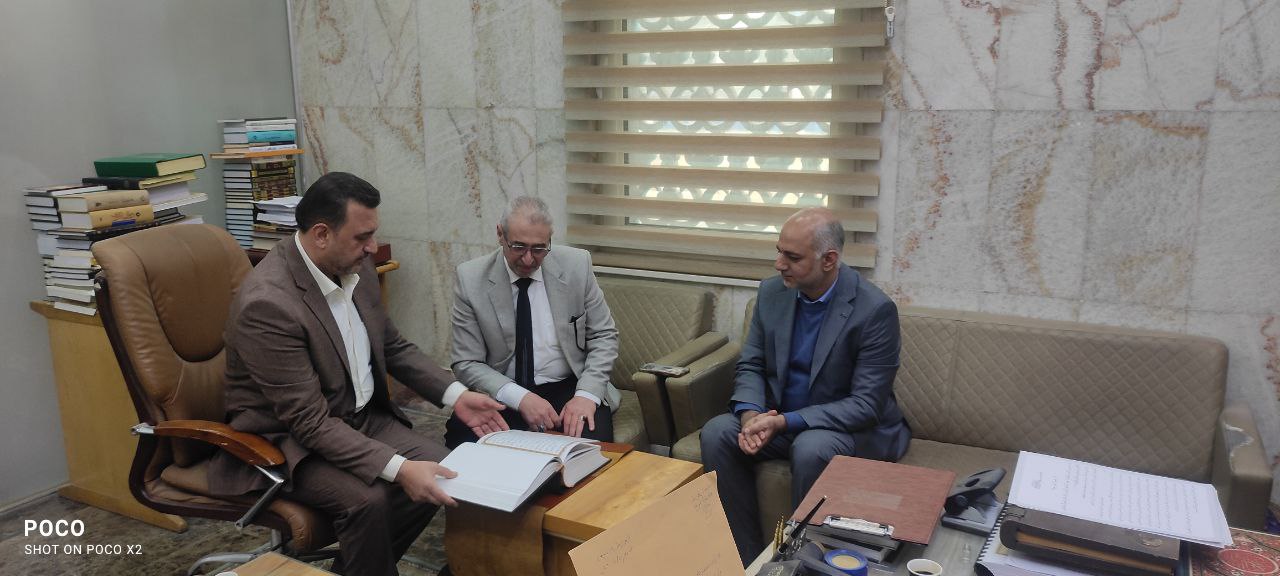 تسلّم وفد من كلية العلوم الإسلامية برئاسة السيد عميد الكلية الدكتور طلال فائق الكمالي المصحفَ الشريف المخطوط بأقلام طلبة وأساتذة ومنسوبي جامعة وارث الأنبياء (عليه السلام)، وذلك بعد إنجاز أعمال تجليده في مركز مخطوطات العتبة الحسينية المقدسة، متمثلاً بـ السيد الدكتور مناف التميمي مدير المركز.