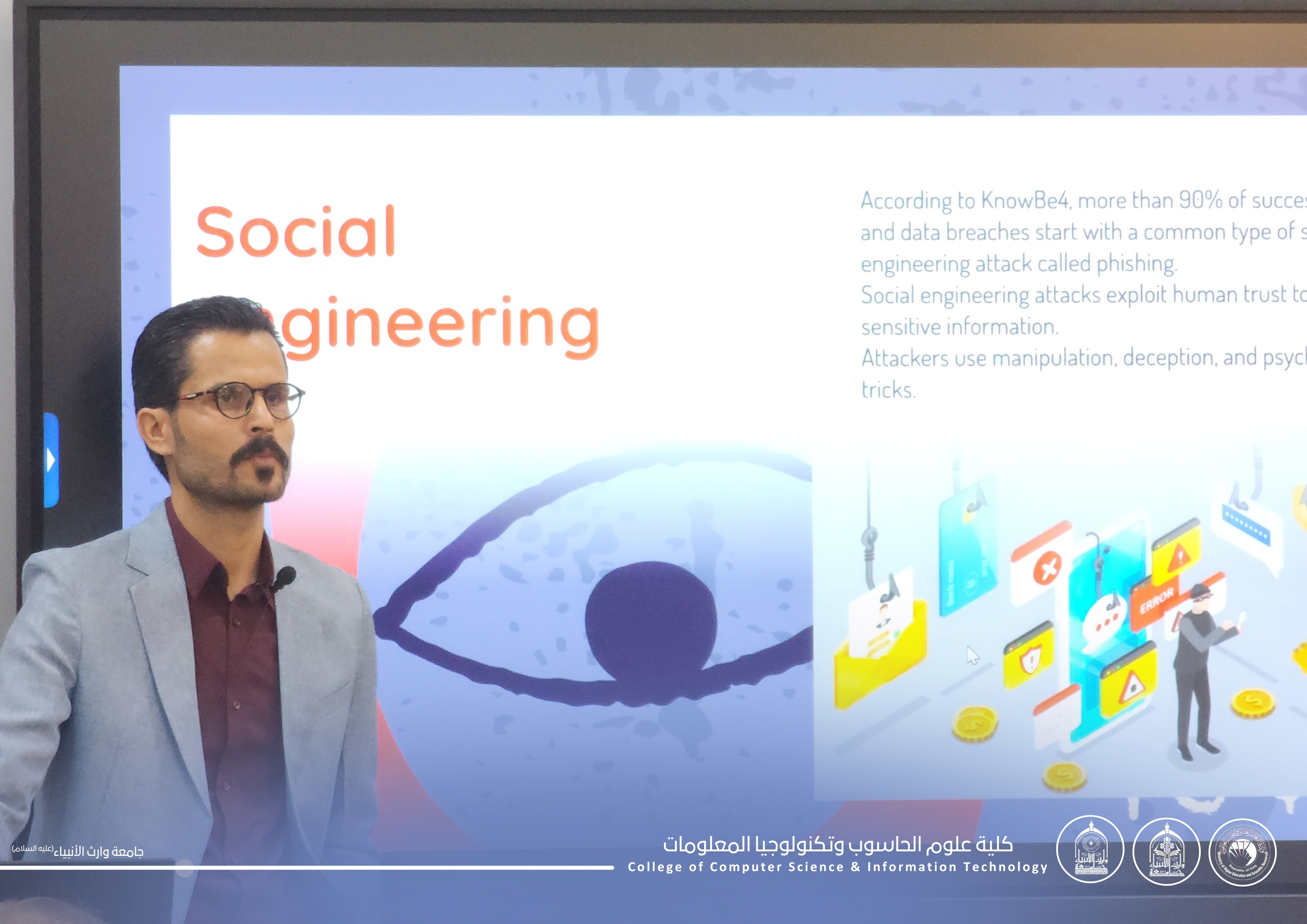 قدّم الورشة م.م مثنى صالح مهدي العلاگي، حيث تناول أبرز مفاهيم الأمن السيبراني، وطرق الوقاية من التهديدات الإلكترونية، إضافة إلى أهمية تبنّي الممارسات الصحيحة لحماية المعلومات الشخصية والمؤسسية.