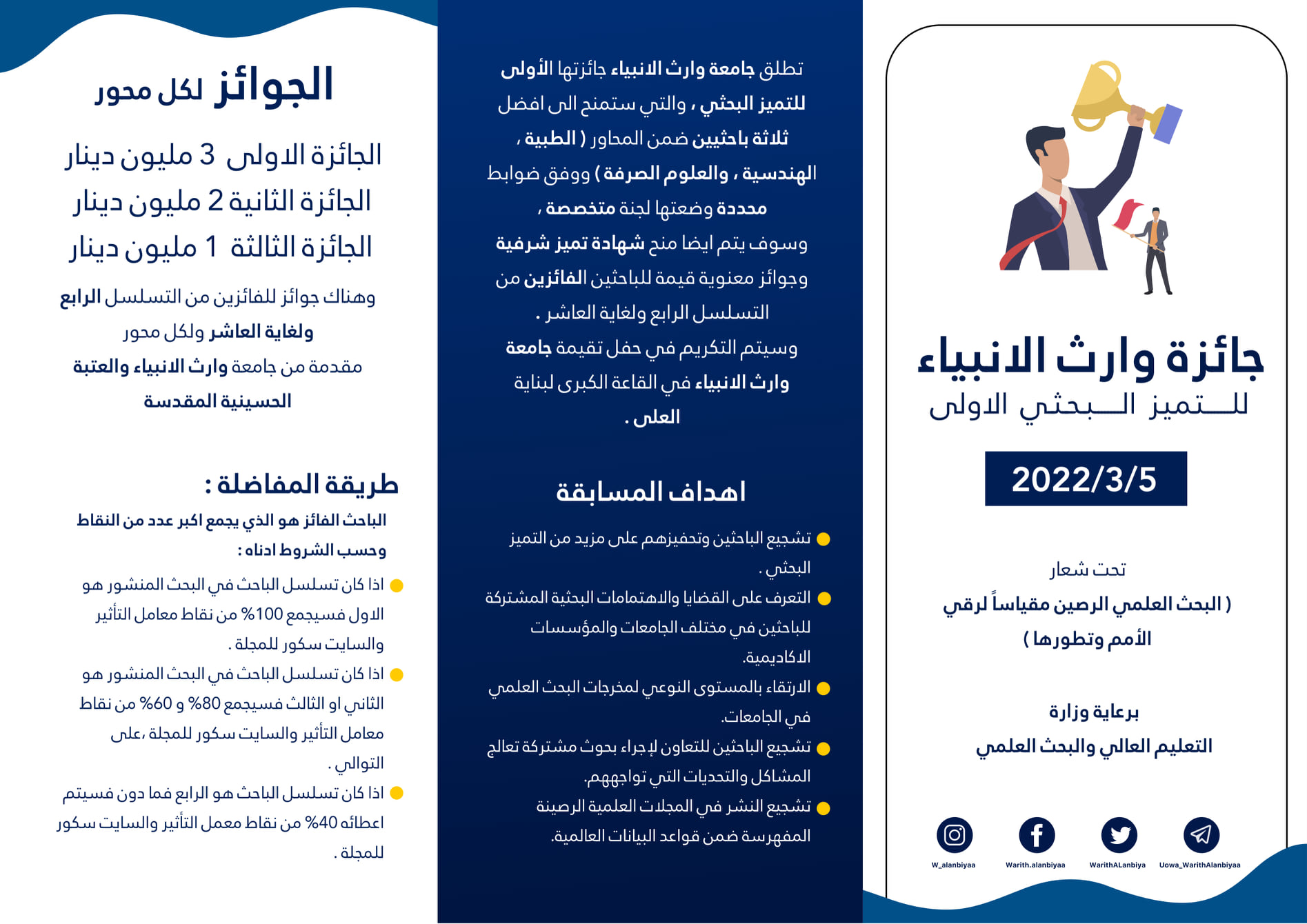 تدعو جامعة وارث الأنبياء (عليه السلام) السادة الباحثين للاشتراك في مسابقتها الأولى لتكريم أفضل الباحثين الأكاديميين العراقيين المتميزين في النشر العلمي الرصين في التخصصات الطبية، والهندسية، و العلوم الصرفة،