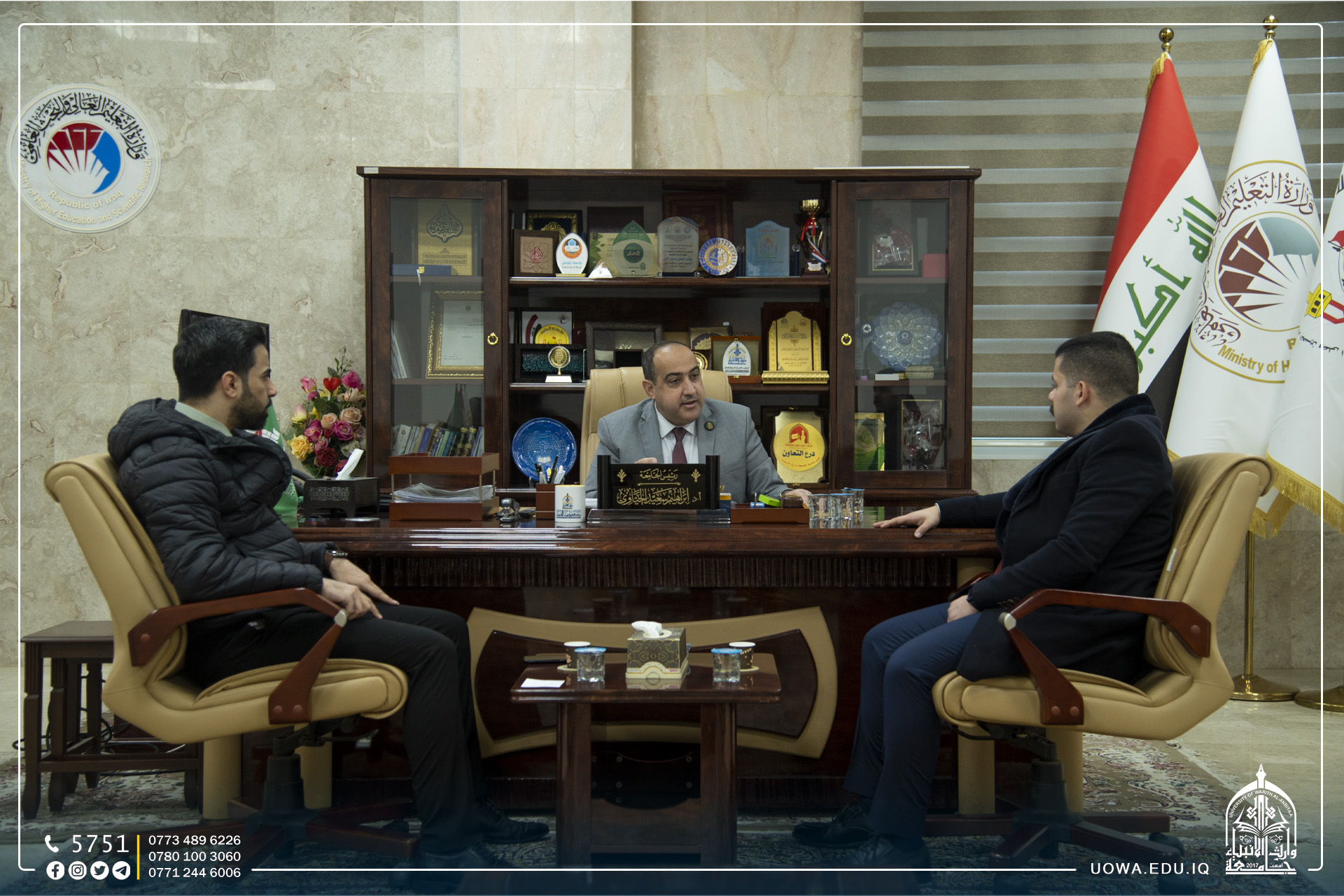 استقبل السيد رئيس الجامعة الاستاذ الدكتور ابراهيم الحياوي بمؤسس فريق عطاء طلبة وارث الانبياء السيد احمد الهر بحضور السيد رئيس قسم ضمان الجودة م.علي عبد الزهرة، للتعرف على اخر نشاطات الفريق وتاكيد دعم رئاسة الجامعة لنشاطاتهم الانسانية ومشاريعهم الخيرية داخل وخارج الجامعة.