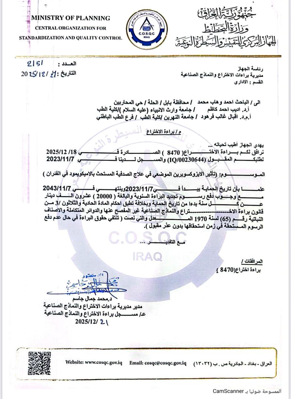 حصل الاستاذ الدكتور أديب أحمد الزبيدي رئيس فرع علم الأدوية في كلية الطب - جامعة وارث الأنبياء على براءة الاختراع الموسومة