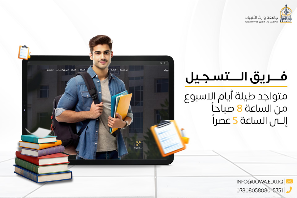 فريق التسجيل في جامعة وارث الأنبياء (عليه السلام) متواجد يوميًا من الساعة 8 صباحًا حتى 5 عصرًا لمساعدتكم في إكمال الخطوات الحالية والإجابة عن جميع استفساراتكم حول التقديم والكليات والأقسام.