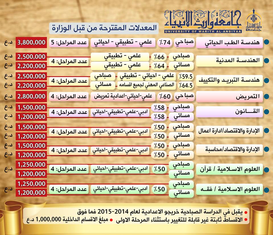 #جامعة_وارث_الأنبياء التابعة للعتبة الحسينية المقدسة ترحب بطلبتها الأعزاء الراغبين بالتسجيل في الجامعة أعزائنا طلبة السادس الإعداديسارعوا بالحصول على مقعد دراسي في جامعة وارث الأنبياء في كلياتها وأقسامها علما ان مدة التقديم ١٠ ايام فقط: ١.كلية الهندسه بأقسامها:-قسم الهندسة المدني -قسم هندسة طب الحَيَاة -هندسة تقنيات التبريد والتكييف ٢.كلية التمريض ٣.القانون ٤.كلية الادارة والأقتصاد -قسم ادارة الاعمال -قسم المحاسبة ٥.كلية العلوم الإسلامية -قسم علوم القران -قسم الفقه وأصوله