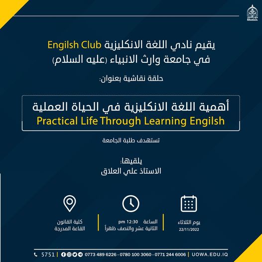 اقام نادي اللغة الانكليزية حلقة نقاشية لطلبة كليات وأقسام الجامعة بعنوان "اهمية اللغة الانكليزية في الحياة العملية" قدمها مدرب اللغة الانكليزية علي العلاق والمدرس المساعد صفا ضياء الدين.
