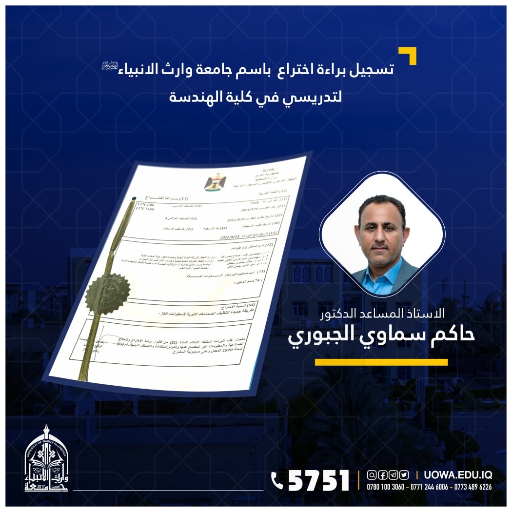 حصل الباحث والتدريسي ا.م.د. حاكم سماوي الجبوري من قسم هندسة تقنيات التكييف والتبري/ كلية الهندسة على براءة اختراع جديدة في هندسة المواد وتآكل المواد الهندسية باستخدام الموجات فوق الصوتية، والتي تعتبر ضمن الدراسات التطبيقية التي تم تطبيقها على اسطوانات الغاز الحديدية في معمل غاز التاجي في بغداد، الذي يعتبر مكان تجمع الاسطوانات التالفة في العراق.