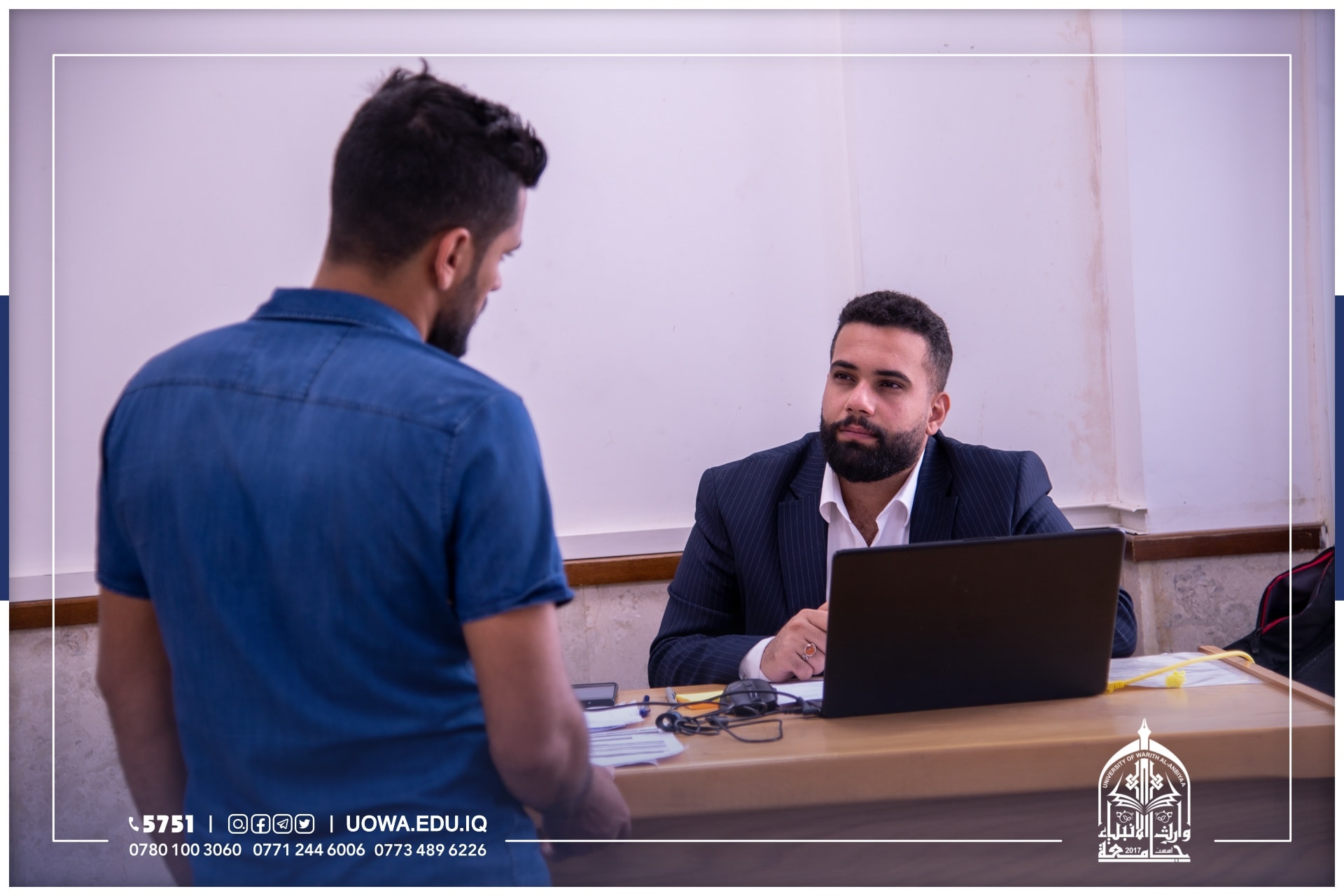 جانب من استقبال فريق التسجيل في جامعة وارث الانبياء (عليه السلام) للطلبة الاعزاء واولياء امورهم الكرام للإجابة عن استفساراتهم ومساعدتهم في انجاز اولى خطوات التقديم، وهي انشاء حساب الطالب وملء البيانات وتفعيل القنوات الخاصة.