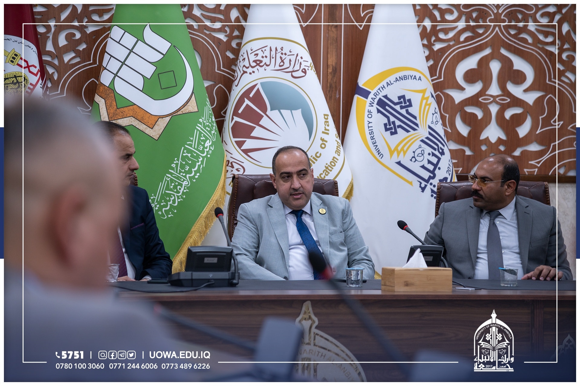 استقبل السيد رئيس الجامعة الاستاذ الدكتور ابراهيم الحياوي رئيس نقابة الاكاديميين في بغداد الدكتور مهند الهلالي يرافقة الدكتور منير الدعمي رئيس نقابة الاكاديميين فرع كربلاء والوفد المرافق لهما، لبحث سبل تعزيز التعاون العلمي بين النقابة والجامعة.