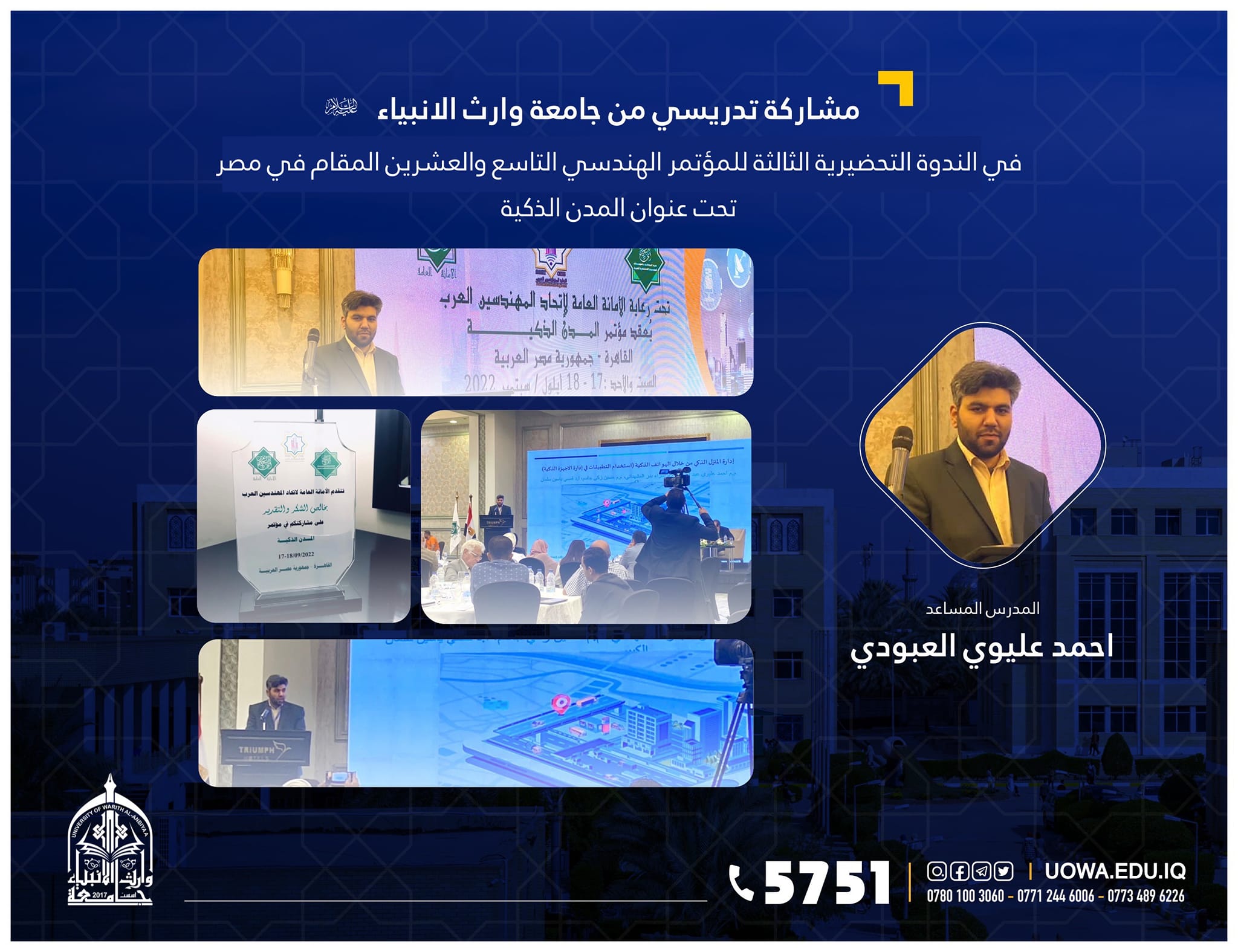 شارك التدريسي في قسم هندسة الطب الحياتي المدرس المساعد احمد عليوي ممثلاً عن جامعة وارث الانبياء(عليه السلام) في الندوة التحضيرية الثالثة "للمؤتمر الهندسي التاسع والعشرين" تحت عنوان "المدن الذكية" المقام في جمهورية مصر العربية، وبرعاية الامانة العامة لاتحاد المهندسين العرب للفترة17-18 ايلول 2022.