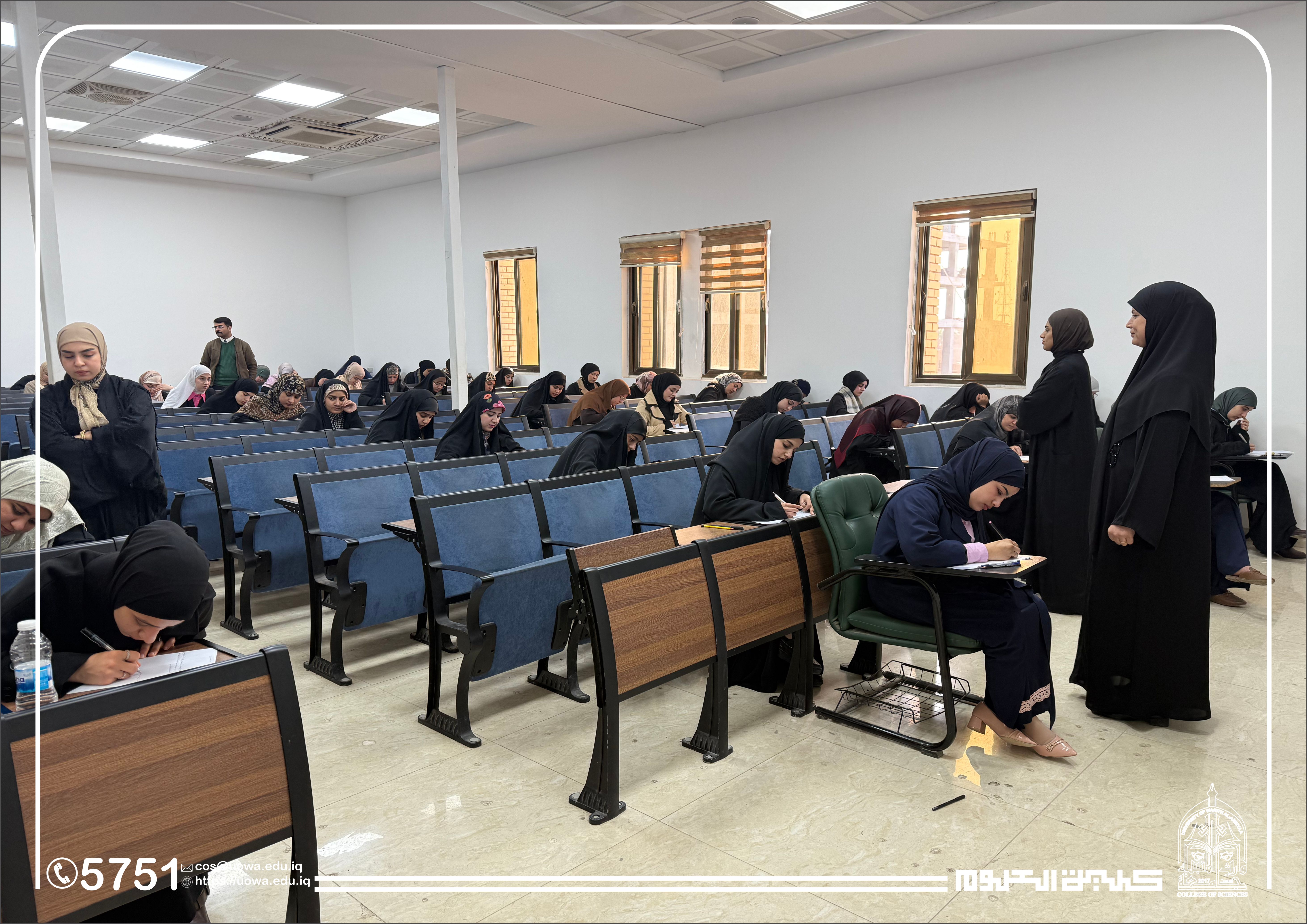 In the context of his continuous follow-up of the academic process and his commitment to providing an appropriate examination environment, the Dean of the College of Science at Warith Al-Anbiyaa University (peace be upon him) conducted an inspection tour of the examination halls to monitor the progress of the midterm examinations for first-year students in the Departments of Medical Physics and Forensic Evidence.