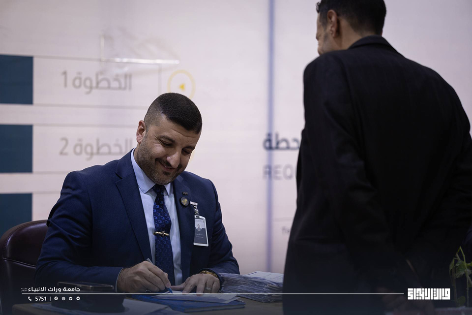 Within the framework of institutional follow-up and the development of administrative performance, the President of Warith Al-Anbiyaa University, Professor Dr Ibrahim Saeed Al-Hayyawi, accompanied by the Scientific Assistant, Professor Dr Waqed Al-Moussawi, held a meeting with the University’s registration team following the commencement of official attendance by first-year students.