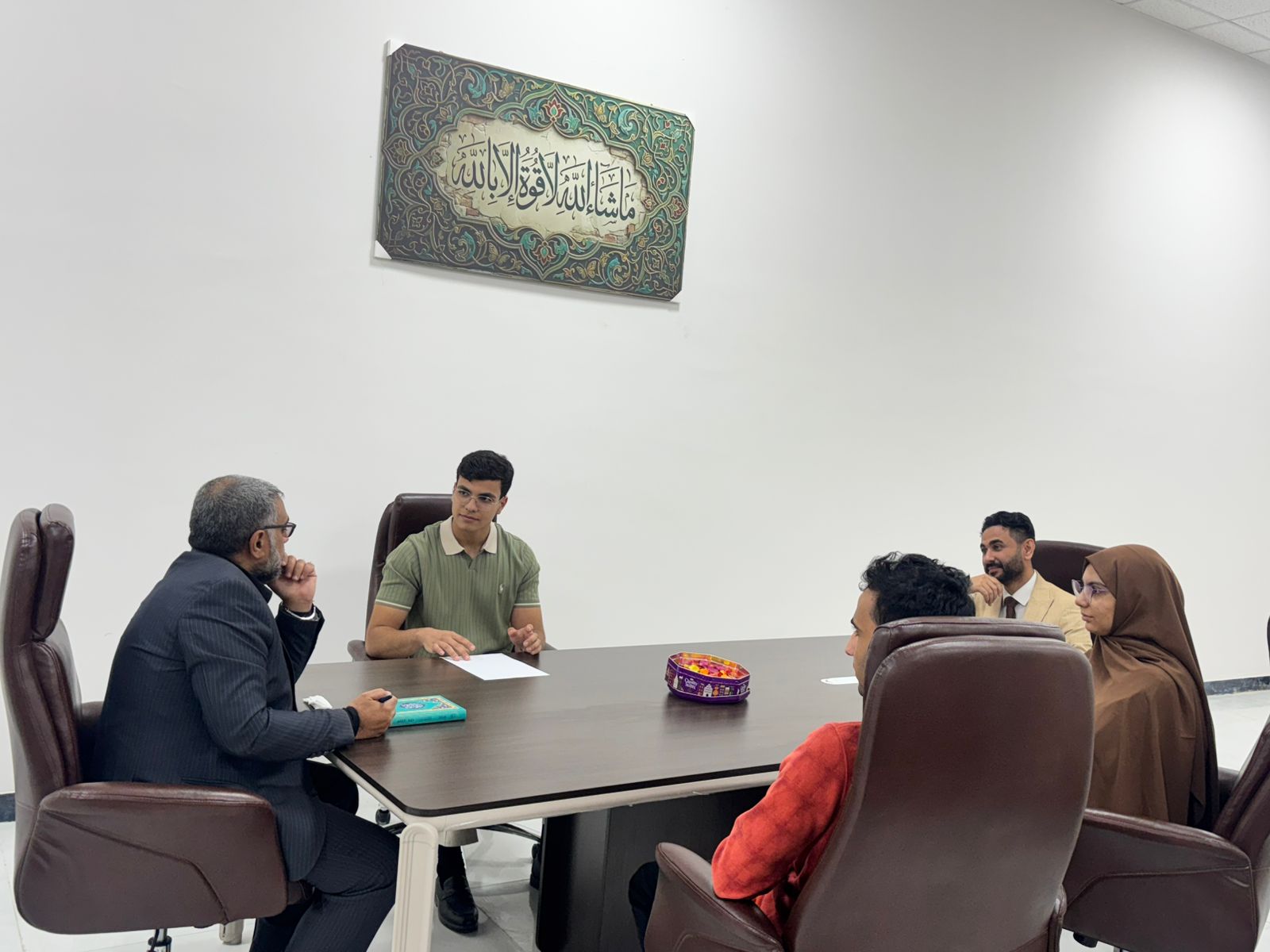 Within the framework of field follow-ups on student affairs, the Dean, Assistant Professor Dr. Laith Mohammed Abbas Al-Husseini, held an extensive meeting with first-year student representatives. The meeting, attended by the Head of the Student Affairs Division, Asst. Lect. Ali Aziz Kadhim, aimed to monitor the educational process and guide the academic path of new students.