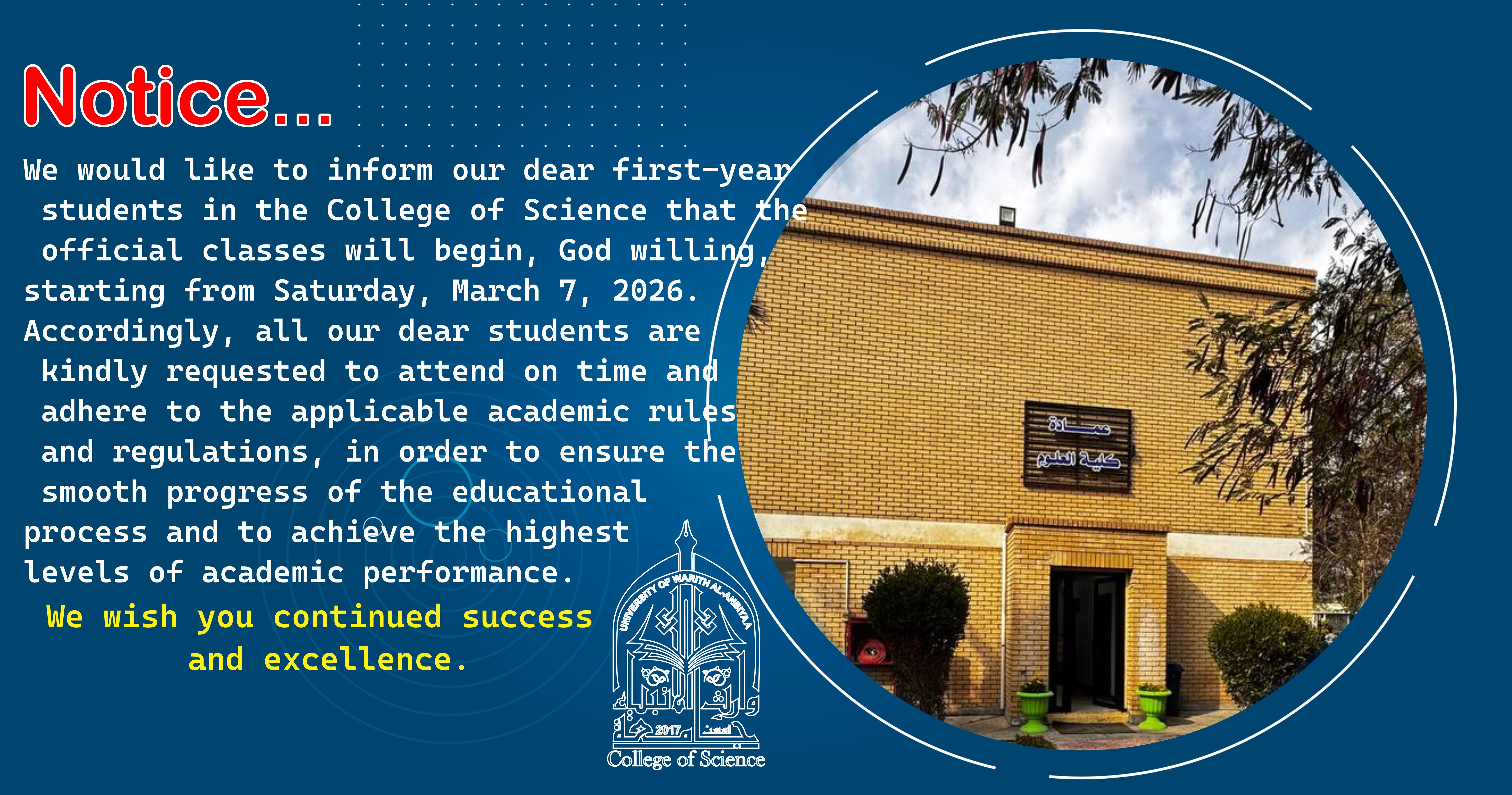 The University of Warith Al-Anbiyaa (peace be upon him) is witnessing continuous expansion in building infrastructure to support ongoing urban development on campus. These developments involve the construction of new buildings equipped with the latest technologies.