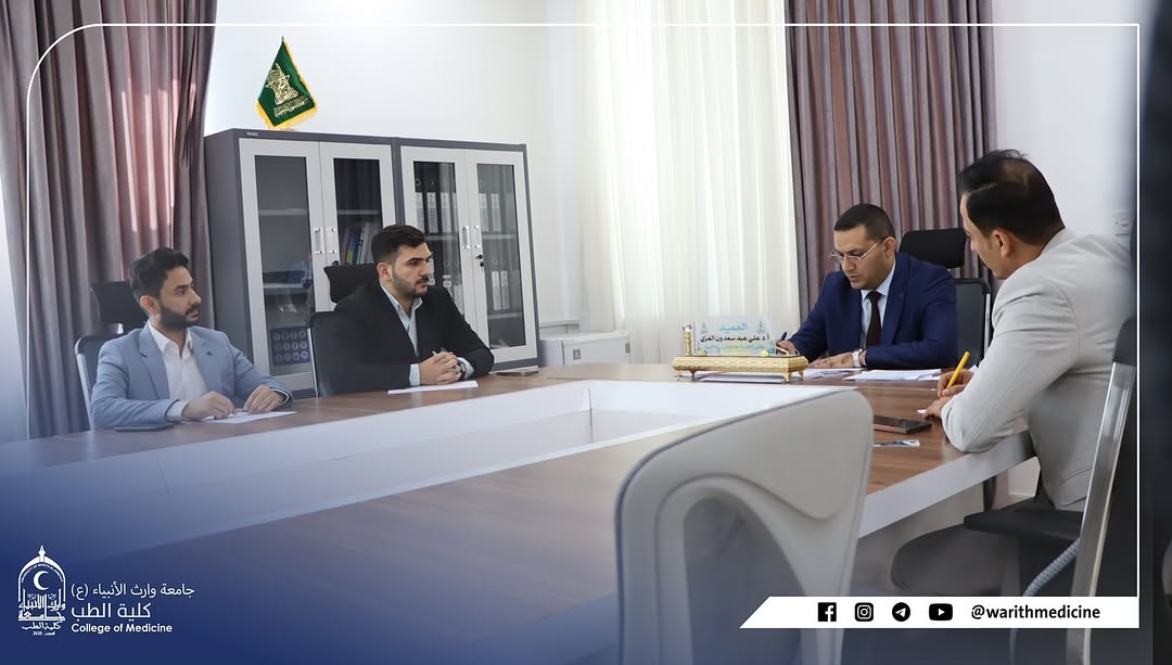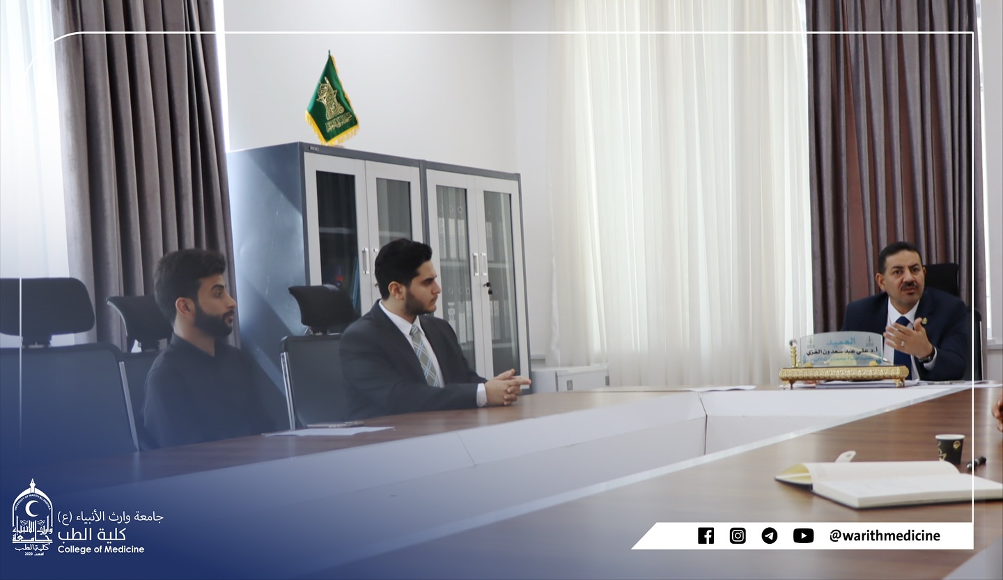 The Dean of the College of Medicine at Warith Al-Anbiya University (peace be upon him), Professor Dr. Ali Abdul Saadoun Al-Ghazi, and the Assistant Dean for Scientific Affairs, Dr. Laith Mohammed Abbas Al-Husseini, held a meeting with student representatives from all academic levels. This meeting was part of the Deanship's commitment to fostering direct communication with its students and listening to their opinions and suggestions. The meeting included discussions on key student and academic issues, listening to student feedback on the educational process and the university environment, and working to overcome any difficulties in line with the College's vision of providing a robust and stimulating academic environment conducive to excellence. During the meeting, the Dean and the Assistant Dean emphasized that the Deanship's doors are always open to students and that the College places great importance on student input, recognizing students as active partners in the development of the academic journey.