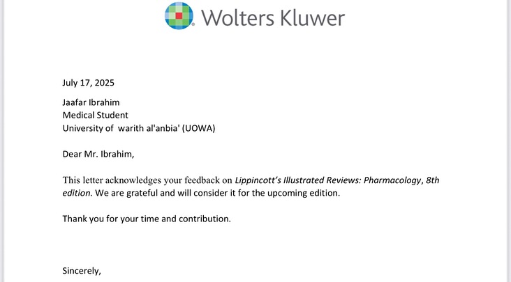 The observation was accepted and its validity acknowledged by the publisher. This is a distinguished scientific achievement that reflects the competence of the medical students at Warith Al-Anbiya University (PBUH) and their commitment to accuracy and academic excellence.
