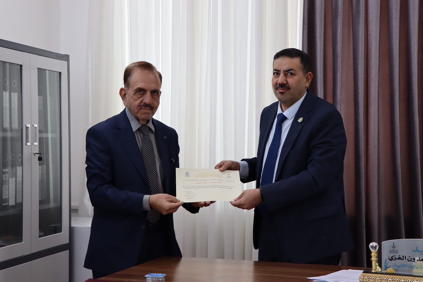 At the conclusion of the meeting, the Dean of the College, Professor Dr. Ali Abdul Saadoun Al-Ghazi, presented letters of thanks and appreciation to the representatives of the Karbala Council of Elders in recognition of their active participation and contribution to supporting the academic and medical development of the University.