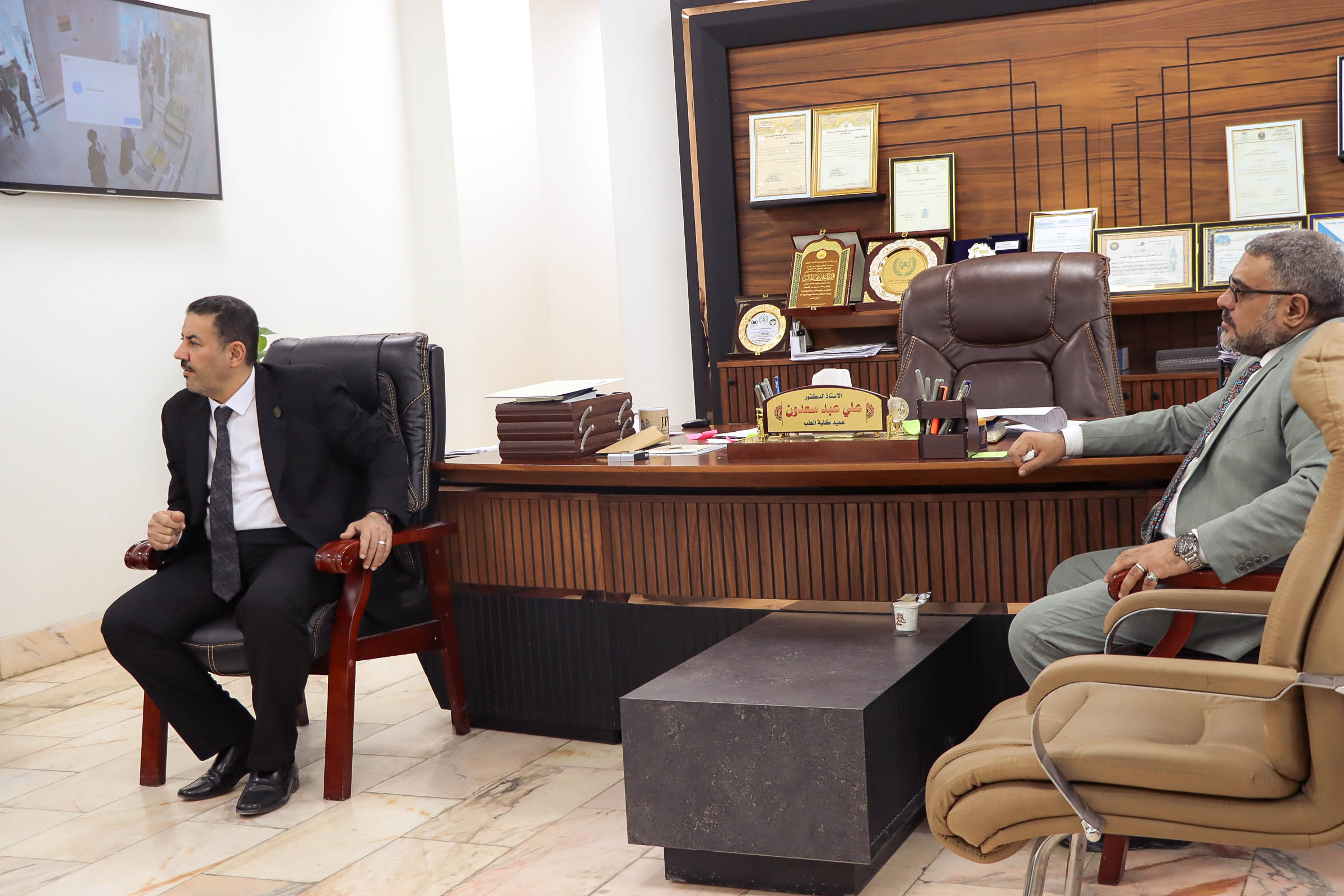 The meeting was attended by the Karbala Council of Elders, represented by its Chairman, Dr. Sayed Yousef Al-Majed, and Dr. Saad Al-Din Hashem Al-Banna, at the kind invitation of the College of Medicine to participate in the discussion on developing the College's vision, mission, and future objectives.